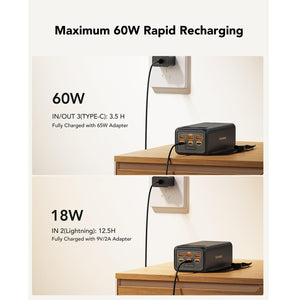 Equipped with 2 PD Type-C ports (100W + 30W) which can provide enough power to simultaneously fast charge a power-hungry MacBook Pro 16'' and an iPad Pro in a full speed. The Type-C in/out also supports 60W rapid recharging.