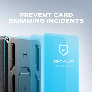 A compact magnetic wallet stores up to two cards with a strong magnetic hold and a zinc-alloy shell that blocks RFID signals to prevent unauthorized scanning and skimming.