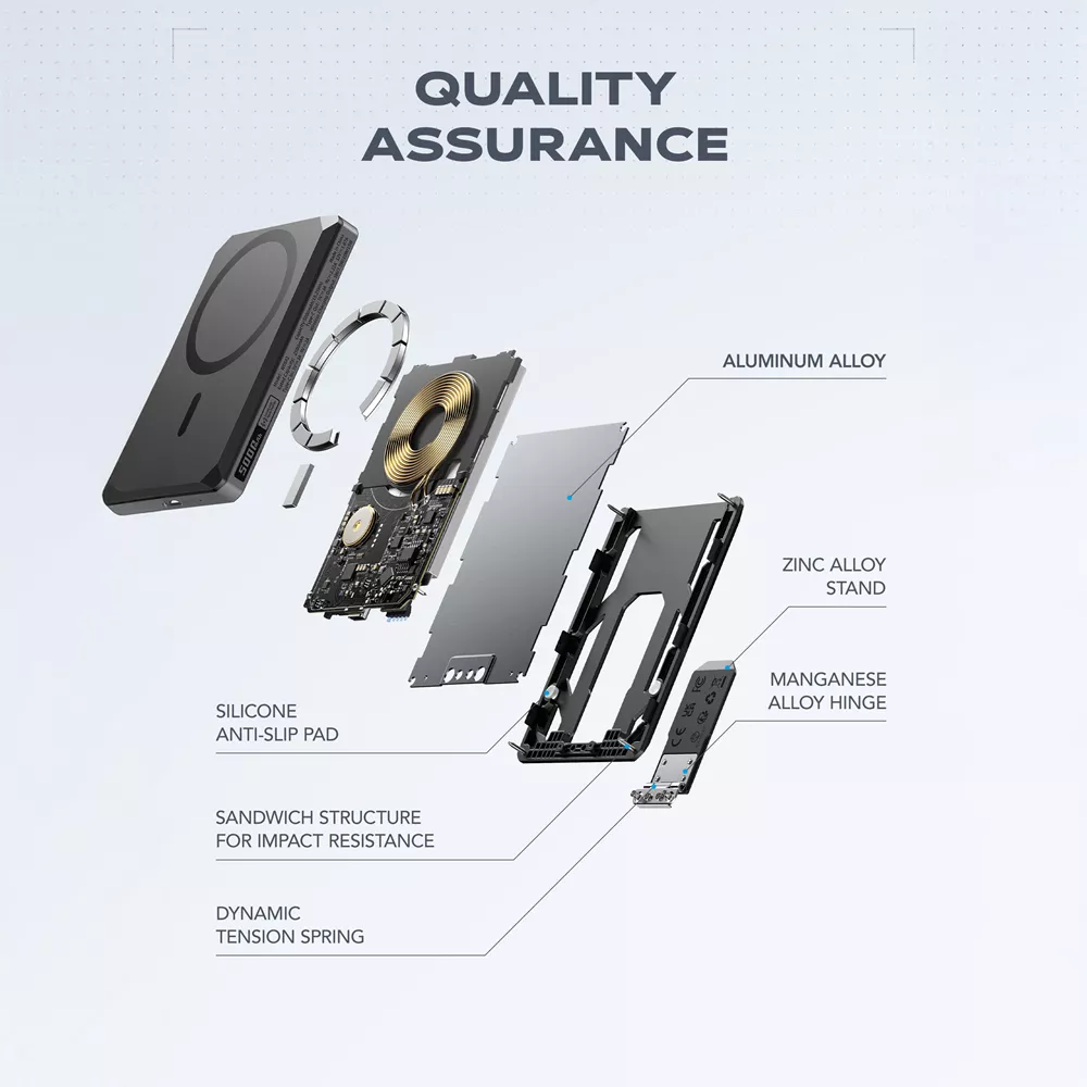 The X5 pairs a slim, travel-friendly profile with durable materials and precision engineering. Manganese-alloy hinges ensure smooth, reliable movement for the wallet and kickstand, while the zinc-alloy body protects cards and electronics. The form factor is airline-compliant and designed to slide easily into a pocket or bag without adding bulk.