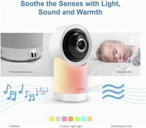 This 7" HD colour monitor allows you clearly see your little one on the parent unit. You can achieve 360 degrees up & down from the parent unit or remote & 10 remote digital x zoom. Free live remote access via a smartphone, with up to 15 hours of video & 22 hours of audio battery life. A soothing multi colour light on the baby unit gently illuminates a dark nursery with a choice of colours. Five soothing sounds and lullabies will help settle baby to sleep. With two way talk back intercom to sooth baby with your own voice. The humidity & temperature sensor will help you control the ideal sleeping environment