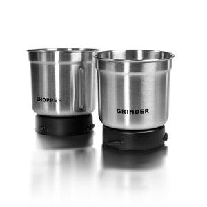 - MULTIPURPOSE - This electric grinder can be used to grind hard and dry foods, such as dried spice, coffee beans, pepper, rock sugar, cinnamon, cumin, bay leaf, dried chili, chickpeas, mint and other relatively dry and crispy materials. Grind and Chop has wet and dry capabilities so you can create herb oils and curry pastes too. The two stainless steel bowls are removable for easy cleaning and the capacity is 70g