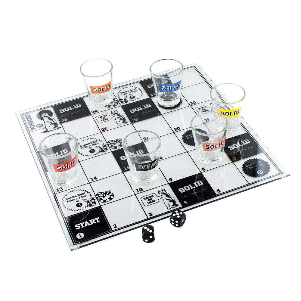 Ideal for a boys' night in or Stag nights down at the boozer Snakes and Bladdered is the ultimate in drinking games. In this grown up version, the snakes remain, however the ladders have been replaced with Truth & Dare squares which requires you to either fess up or drink up. Plus the squares require you or a nominated friend to down a single or double shot. Unlike the child's game where your counter is a little round disc, the Snakes and Bladdered game counter is a shot glass.