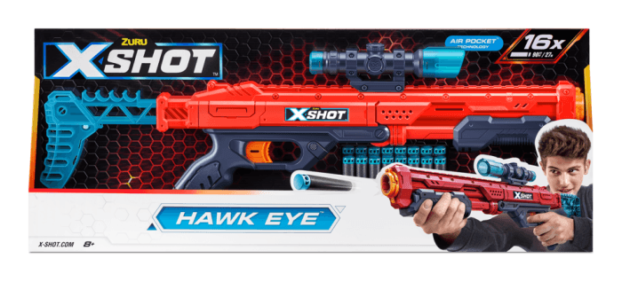 • Accuracy: The X-Shot Excel Hawk Eye comes with detachable scope and tactical grip handle to blast with precision.
