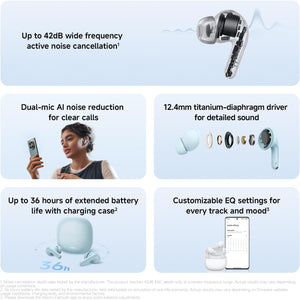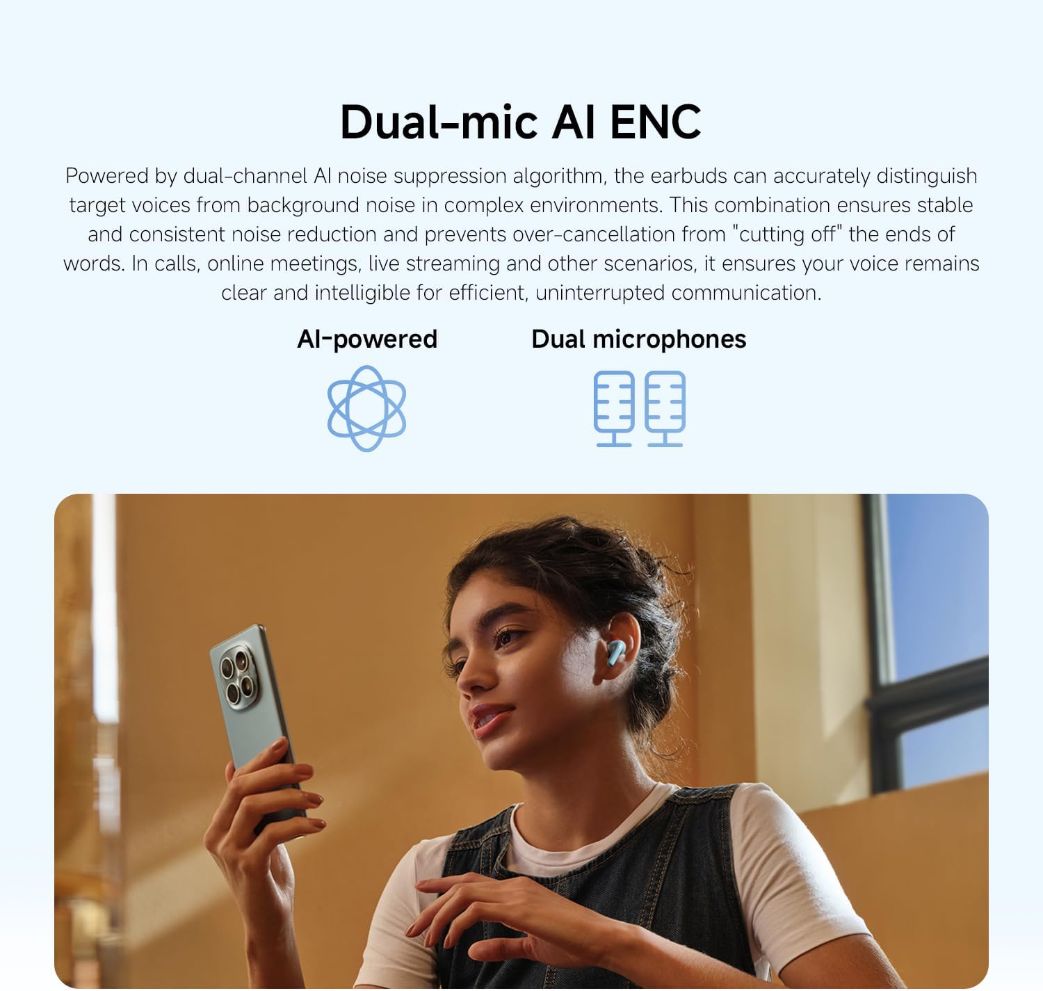 - Dual-mic AI noise reduction for clear calls:Powered by dual-channel AI noise suppression algorithm, the earbuds can accurately distinguish target voices from background noise in complex environments. This combination ensures stable and consistent noise reduction and prevents over-cancellation from "cutting off" the ends of words. In calls, online meetings, live streaming and other scenarios, it ensures your voice remains clear and intelligible for efficient, uninterrupted communication.