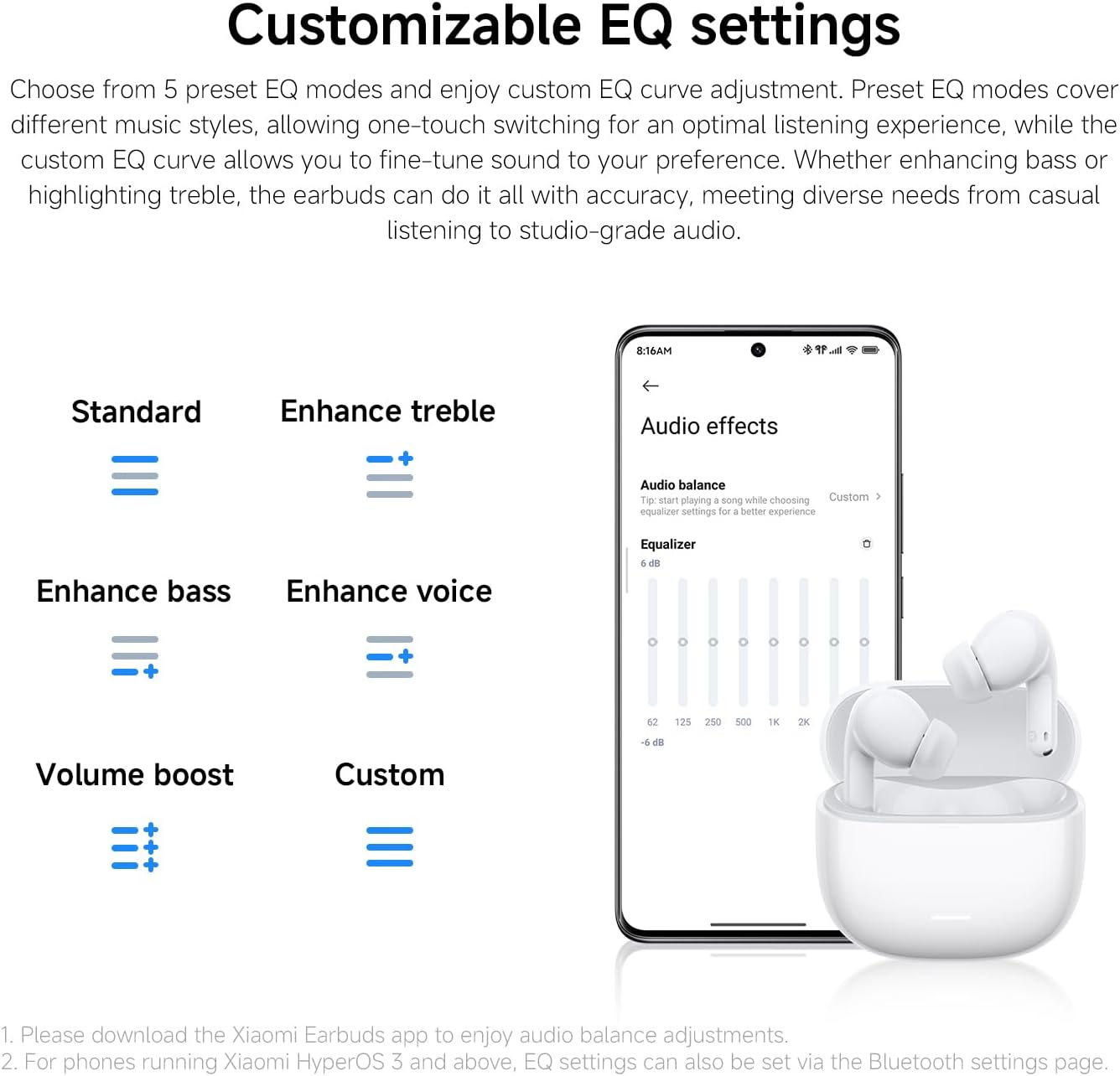 - Customizable EQ settings for every track and mood:Choose from 5 preset EQ modes and enjoy custom EQ curve adjustment. Preset EQ modes cover different music styles, allowing one-touch switching for an optimal listening experience, while the custom EQ curve allows you to fine-tune sound to your preference. Whether enhancing bass or highlighting treble, the earbuds can do it all with accuracy, meeting diverse needs from casual listening to studio-grade audio.