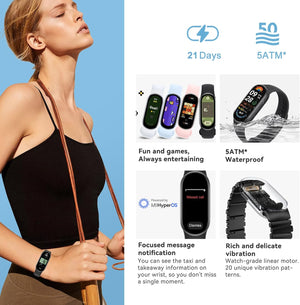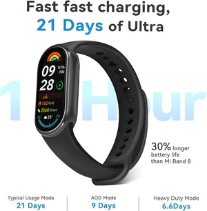 - LONG-LASTING BATTERY AND WATER RESISTANCE: Thanks to professional low-power consumption sensors and smart power consumption algorithms, Xiaomi Smart Band 9 has an extraordinary battery life of 21 days with regular use. In addition, it is water resistant and you can wear it while swimming: it withstands pressure equal to a depth of 50 meters