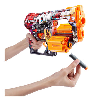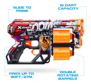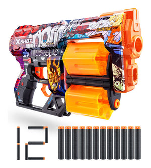 • Dart Capacity: The XSHOT Skins Dread has a 12-dart capacity dual rotating barrels. When you run out of darts in one barrel, simply switch over to the second one to blast the competition away!